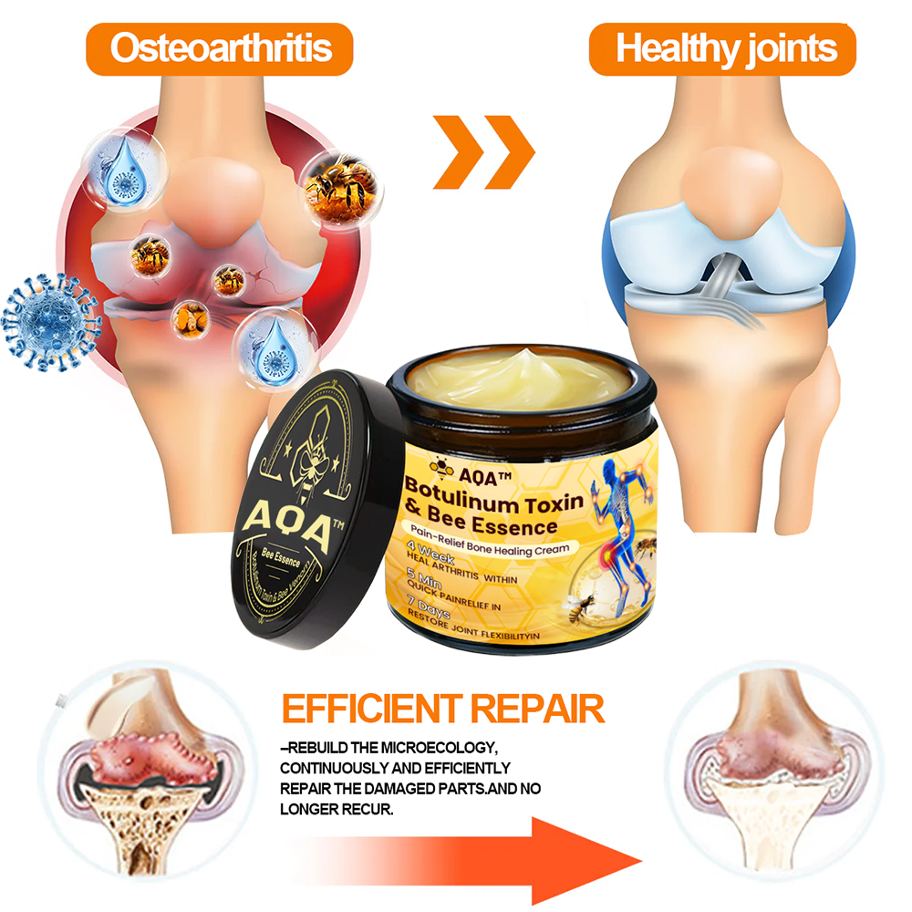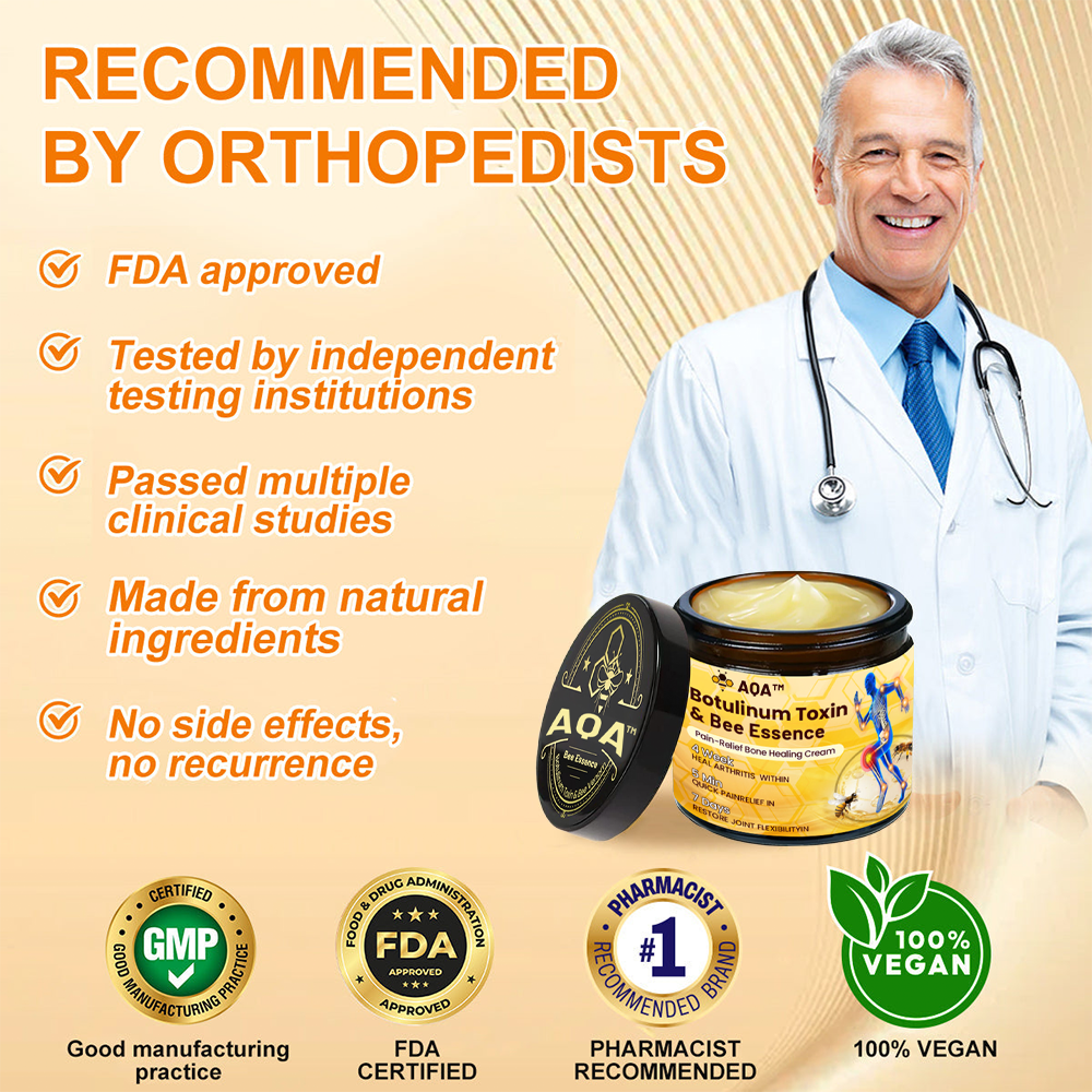 "As an orthopedic doctor, I highly recommend AQA Botulinum Toxin & Bee Essence Pain Relief and Bone Healing Cream for patients suffering from osteoarthritis, rheumatoid arthritis, and other inflammatory joint and bone conditions. This cream contains botulinum toxin, Bee Essence extract, glucosamine, chondroitin, and other highly effective active ingredients that help reduce inflammation, nourish the joints, and enhance mobility. It also aids in rebuilding and restoring cartilage and bone tissue, relieving pain and stiffness, while eliminating harmful crystals that may accumulate in the joints, ultimately improving overall joint function."